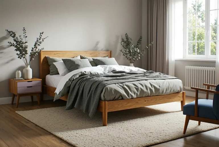 - Wizualne ocieplenie przestrzeni: Nawet jeśli zdecydujesz się na chłodniejsze kolory ścian w swojej sypialni (na przykład popularny błękit lub chłodną, gołębią szarość), solidne meble wykonane z jasnego drewna doskonale i skutecznie zbalansują ostateczną temperaturę wizualną wnętrza, nadając mu niezwykle domowy, ciepły i przyjazny charakter, do którego chce się wracać.
