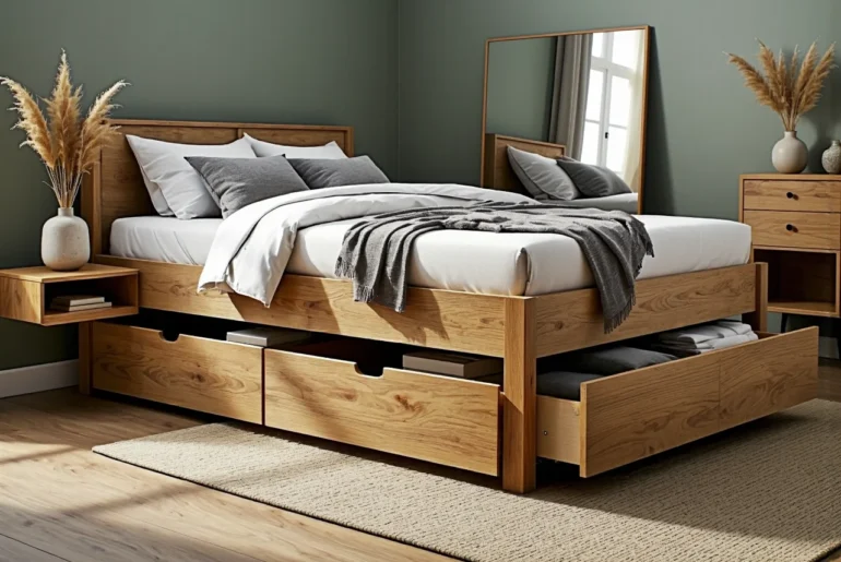 - Szafki wbudowane prosto w wezgłowie: Zastępują standardowe, odstające stoliki, kryjąc w sobie zaskakująco dużo miejsca.