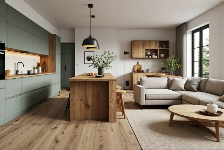Dobre połączenie materiałów to podstawa sukcesu. Zamiast dzielić podłogę na płytki w kuchni i panele w salonie (co optycznie bardzo pomniejsza i szatkuje przestrzeń), architekci zalecają zastosowanie jednego, spójnego materiału na całej powierzchni. Świetnie sprawdzą się wysokiej klasy panele winylowe LVT lub deski warstwowe pokryte twardym lakierem – są one odporne na wilgoć i ścieranie, co pozwala na ich bezpieczne stosowanie również pod zabudową kuchenną.